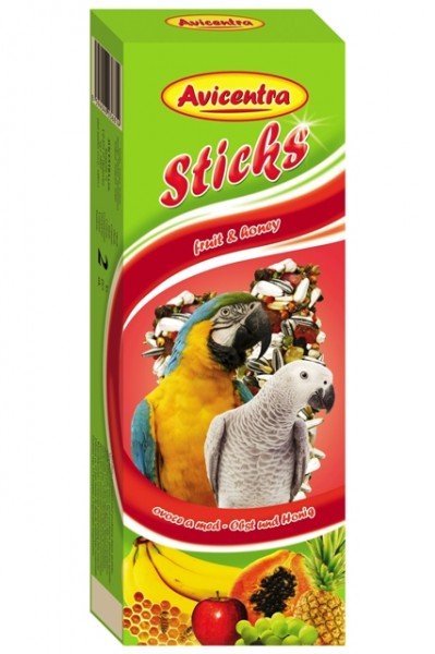 Doplňkové krmivo pro velké papoušky. Tyčinky s ovocem jsou výbornou pochoutkou, ale také krmivem, které Vašemu mazlíčkovi dodává důležité vitamíny a minerály pro zdravý a vitální život. Tyčinky jsou speciální krmivo, kde musí Váš mazlíček vyvinou úsilí k získání své potravy podobně jako v přirozeném prostředí. To napomáhá jeho fyzické a psychické kondici.