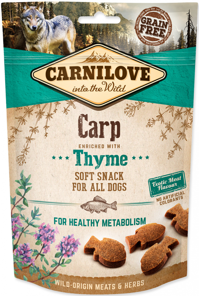 Carnilove poloměkký kapří pamlsek s tymiánem. Pamlsek pro zdravý metabolismus, bez obsahu obilovin a brambor je vhodný pro psy všech plemen.