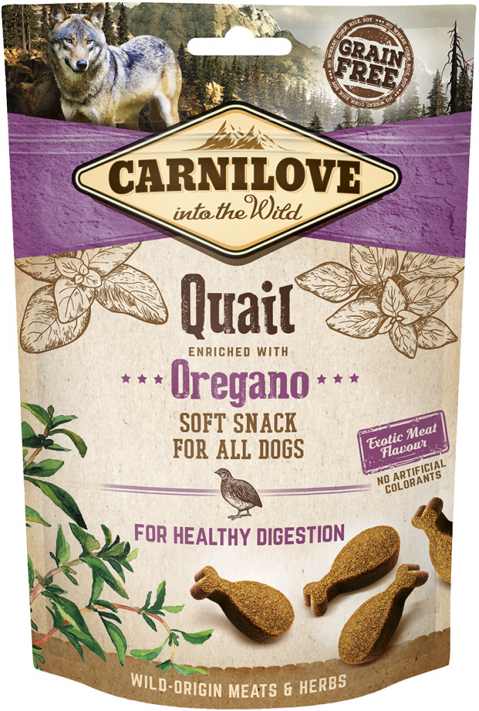 Carnilove křepelčí poloměkký pamlsek s oreganem. Pamlsek pro zdravé trávení, bez obsahu obilovin a brambor je vhodný pro psy všech plemen.