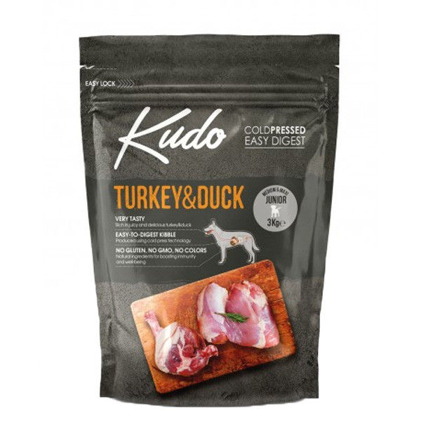 Kudo Dog Adult Medium & Maxi Turkey & Duck je kompletní za studena lisované krmivo s obsahem krůtího a kachního masa splňující nutriční požadavky dospělých psů středních a velkých plemen od 1. roku života. S vysokým obsahem masa je krmivo neodolatelné pro Vašeho psa. S vyváženým poměrem látek zajišťuje zdravý vývoj kostí a kloubů. Bezlepková formule se dvěma druhy živočišné bílkoviny: krůtí a kachní.