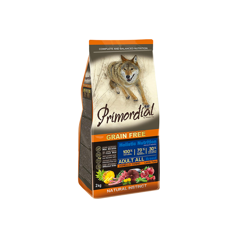 Primordial Jehněčí a Tuňák je kompletní bezobilné krmivo bohaté na proteiny vysoké biologické hodnoty a obsahuje vhodnou kompozici aminokyselin. Tuňák a jehněčí maso striktně z volného výběhu poskytují jednoduše stravitelné bílkoviny a atraktivní chuť, kterou psi milují. Tuňák je navíc bohatý na minerální soli a omega 3 mastné kyseliny, které vykonávají důležitou kosmetickou funkci pro kůži a srst a jsou velmi prospěšné pro srdce a cévy. Ovoce a zelenina bohaté na vitaminy, minerály a fytonutrienty, trávicí vlastnosti ananasu, antioxidační funkce granátového jablka a šípku a podpora jater ze strany pampelišky dodávají tomuto krmivu dokonalou rovnováhu chuti, živin a zdraví. Jedná se o skutečně holistický produkt, který aktivně přispívá k celkovému zdraví psa.