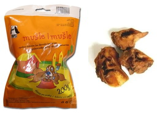 Mušle jsou ušní výkroje. Jejich nespornou předností je vysoký obsah kolagenu, elastinu a minerálních látek. Jsou tučnější než uši a proto pozor na podávání mušlí u pejsků s nadváhou.