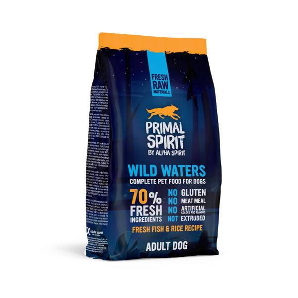 Primal Spirit 70% Wild Waters za studena lisované granule pro štěňata a dospělé psy všech plemen s vysokým obsahem celých čerstvých ryb z Atlantiku doplněné o hydrolyzovanou rýži, ovoce a zeleninu. Krmivo s nízkým obsahem obilovin. Bez obsahu lepku, masokostní mouček, bez umělých konzervantů, dochucovadel a barviv. Krmivo bez extrudace.