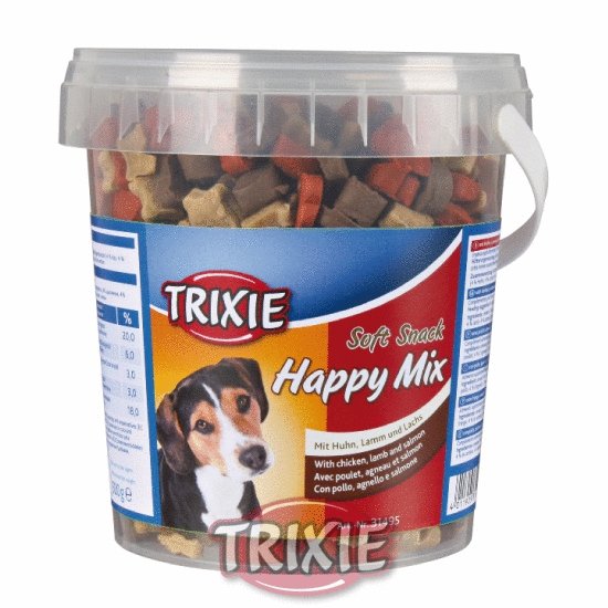 Měkké pamlsky Soft Snack Happy MIX. Báječná odměna pro vašeho psa. V balení najdete 3 různé příchutě pamlsků, a to kuřecí, jehněčí a losos. Bez přidaných cukrů. Znovuuzavíratelný kbelík udrží pamlsky čerstvé.