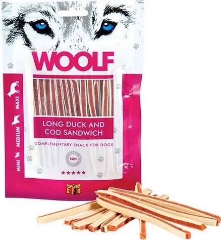 WOOLF pochoutka soft duck and cod sandwich long 100gSkladem69 Kč/ ks62 Kč bez DPH
